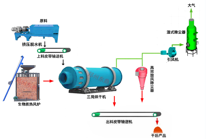 啤酒糟烘干機生產線主要由脫水設備、熱源、上料機、進料機、回轉滾筒、出料機、引風機、卸料器和配電柜、粉碎系統、打包系統等部件構成,可根據酒糟的粗細程度進行工藝選型。